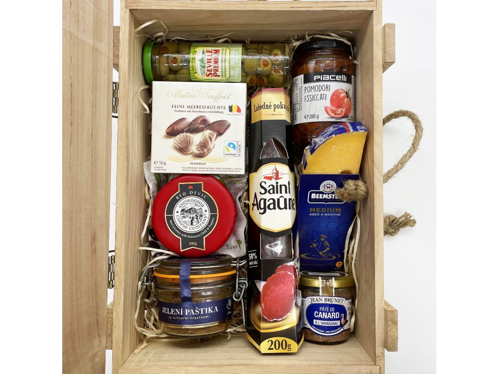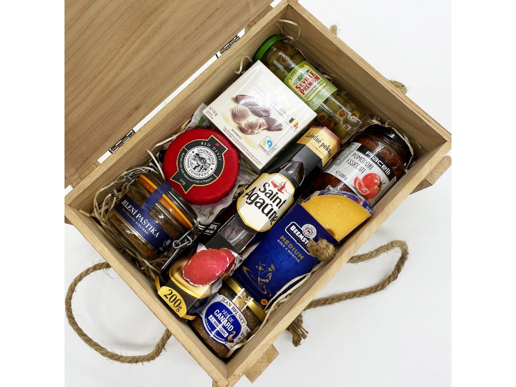 Vděčný dárek pro muže i ženy k narozeninám plný rozličných chutí. Baleno v dřevěné kazetě s dřevitou vystýlkou a atlasovou stuhou.