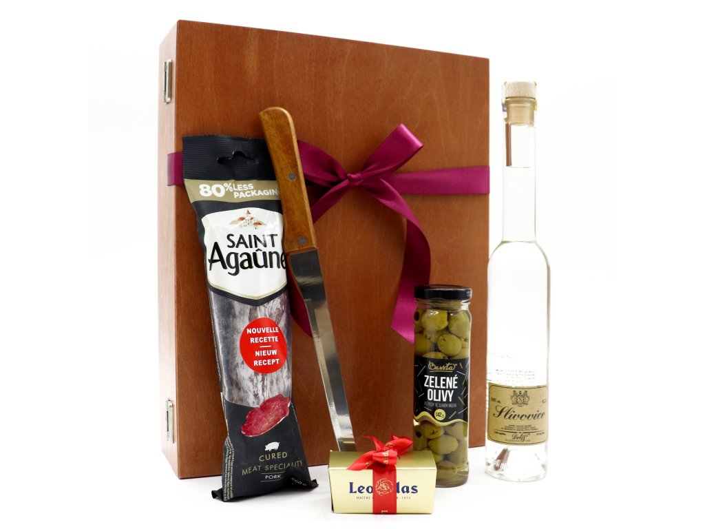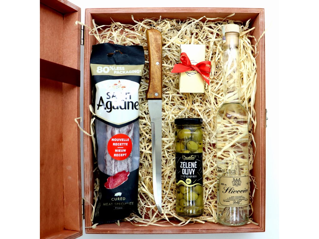 Originální dárková kazeta pro každého muže, milovníka masa, slivovice a žen.