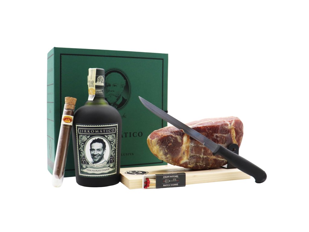 Kvalitní zpracovaná kazeta v designu knihy s uzavíráním. Uvnitř lahev vynikajícího rumu Diplomático Reserva Exclusiva o objemu 0,7l, sušená španělská kýta jamón Curado 1kg a Leonidas pralinky. Vybrat si můžete z varianty s vlhkým doutníkem v tubusu a doutníkovými zápalkami i bez.