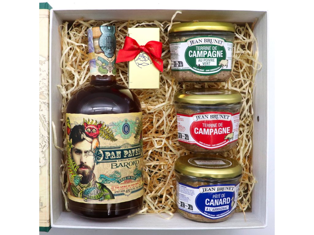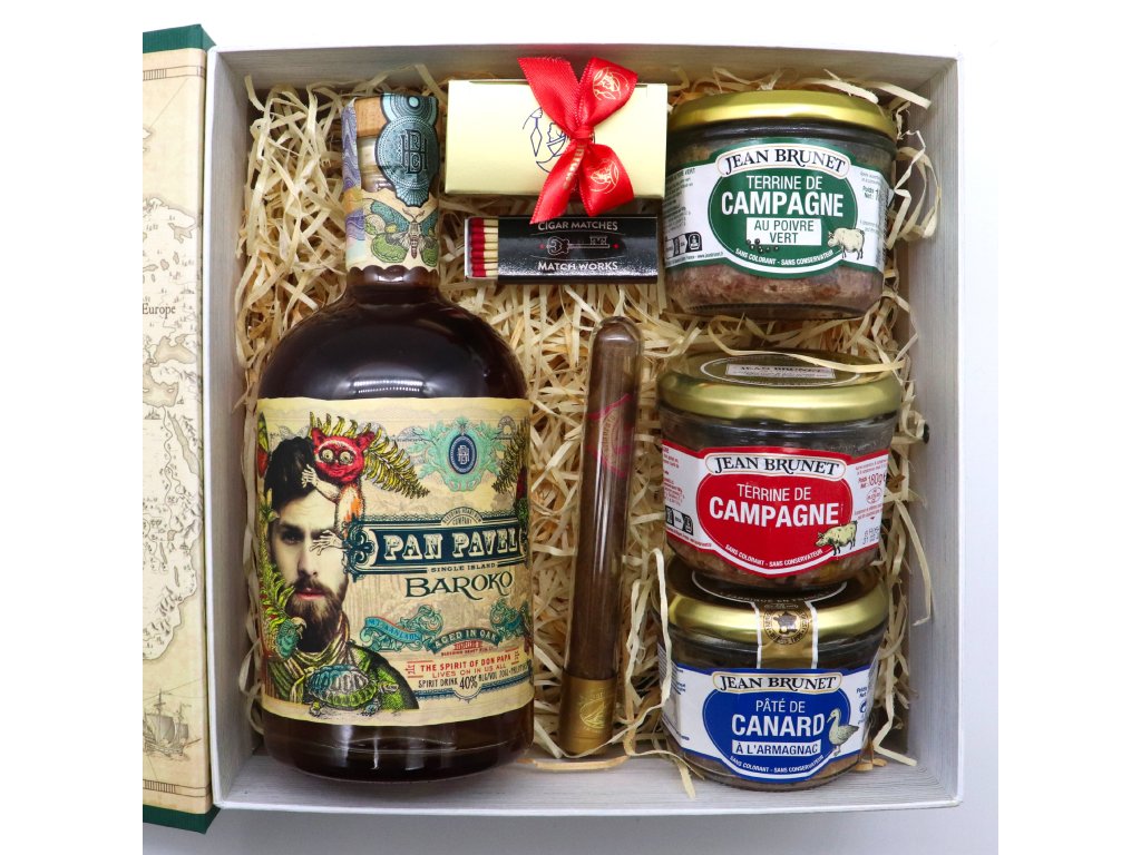 Kvalitní zpracovaná kazeta v designu knihy s uzavíráním. Uvnitř lahev vynikajícího rumu Don Papa Baroko o objemu 0,7l, třemi francouzskými paštikami a Leonidas pralinky. Vybrat si můžete z varianty s vlhkým doutníkem v tubusu a doutníkovými zápalkami i bez.