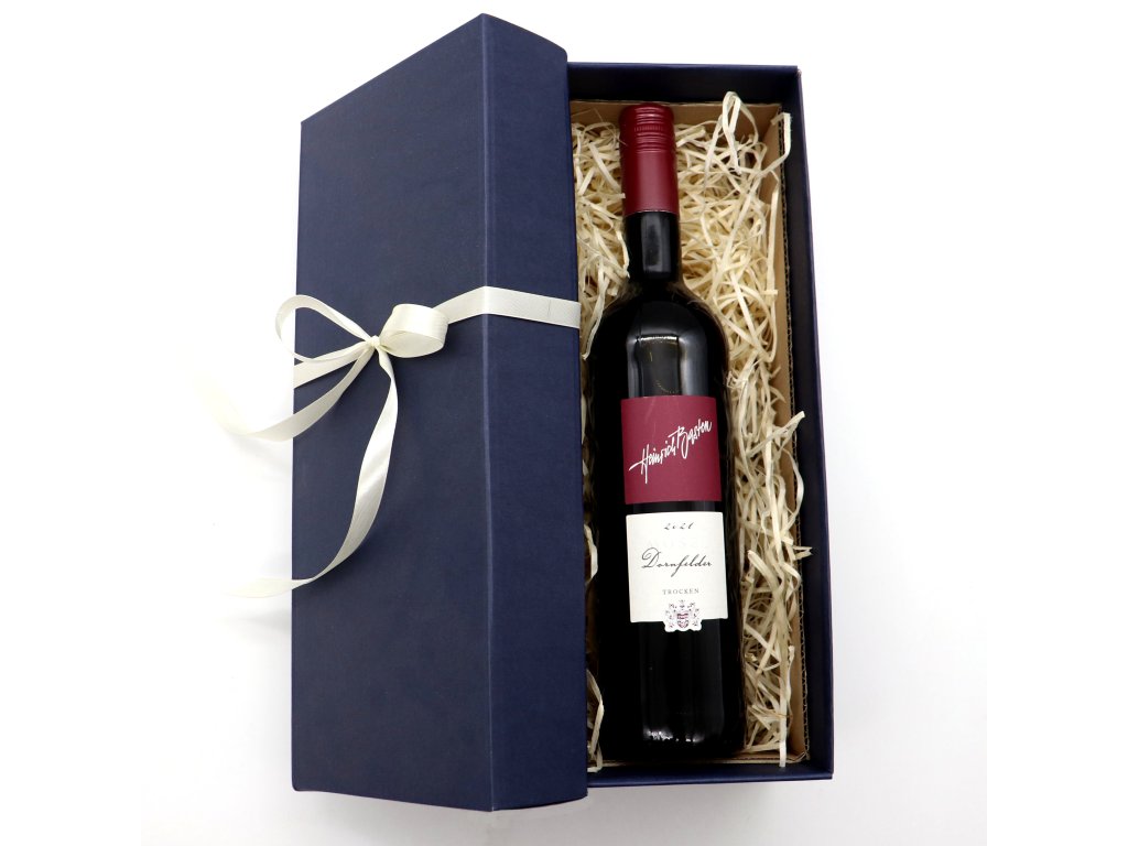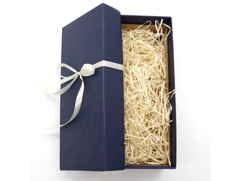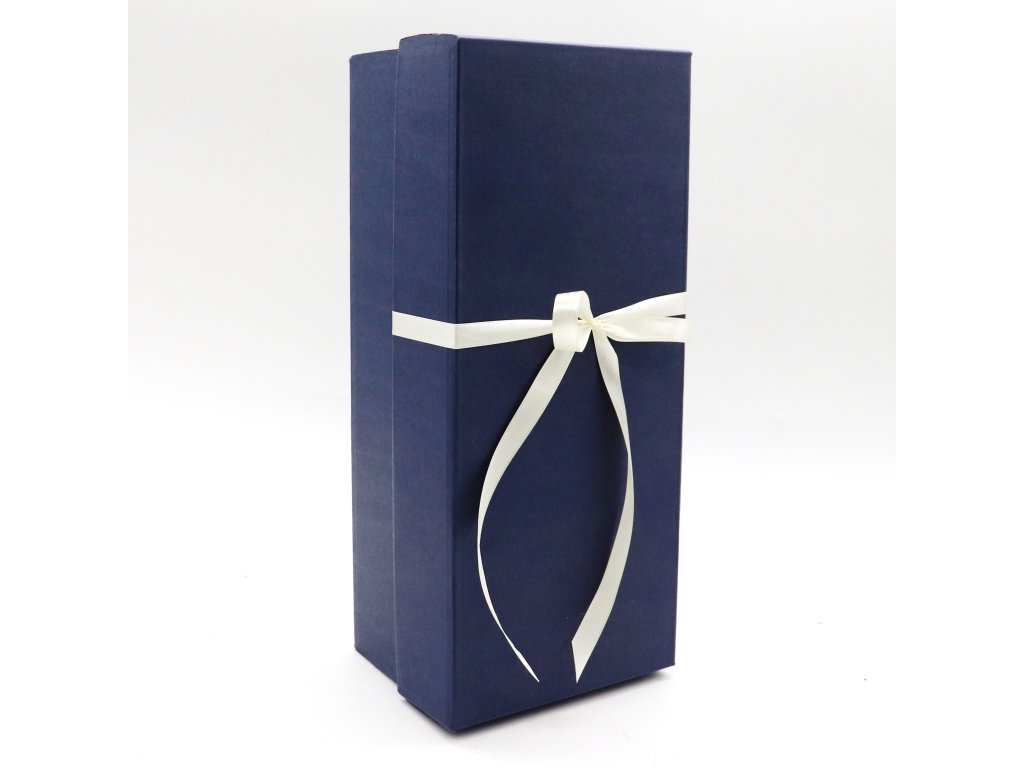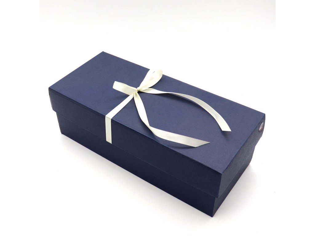 Kartonová dárková krabice s víkem a atlasovou stuhou.