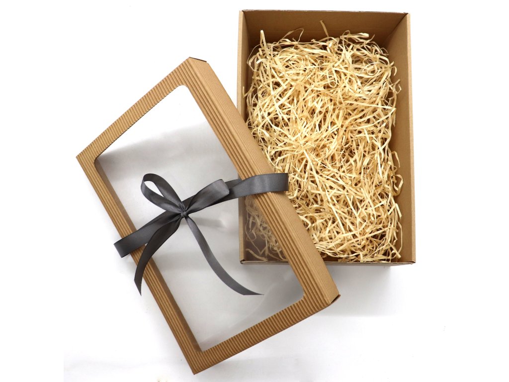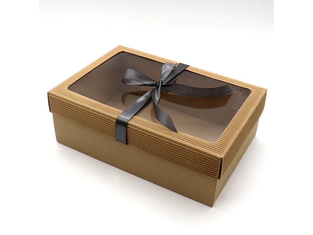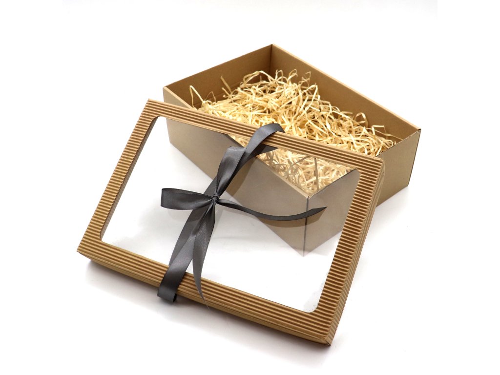 Kartonová dárková krabice s výřezem. Lze opatřit atlasovou stuhou.