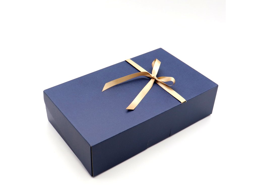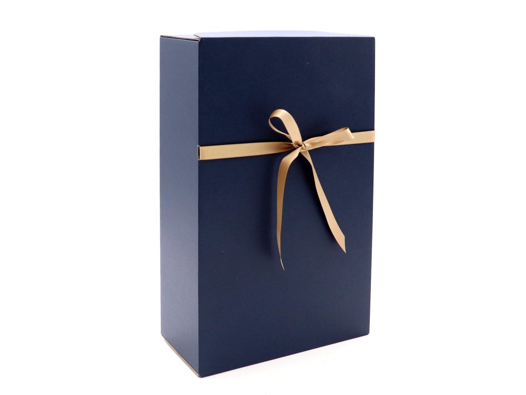 Kartonová dárková rozevírací krabice s atlasovou stuhou.