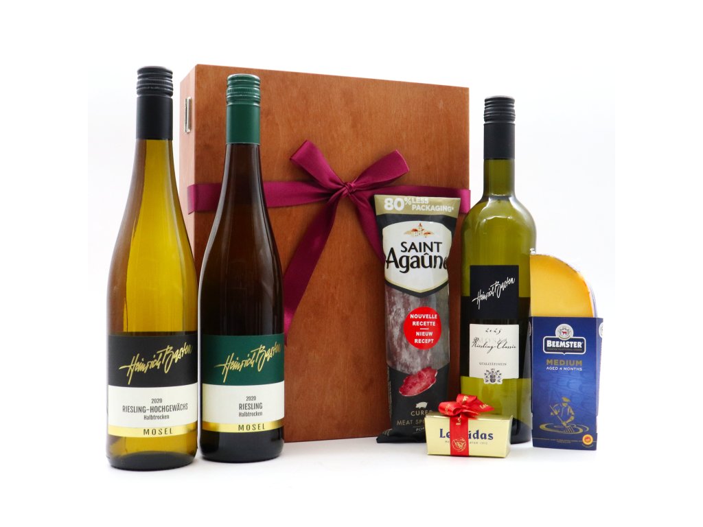 Krásná dárková sada s výběrem 3 bílých moselských rieslingů na dřevité vlně s vynikajícím sýrem a sušenou panenkou ve skvělé chuťové kombinaci udělá skutečnou radost každému milovníkovi svěžích mladých vín. Ideální a praktický vánoční dárek pro rodinnou sešlost, na posezení s přáteli nebo k narozeninám.