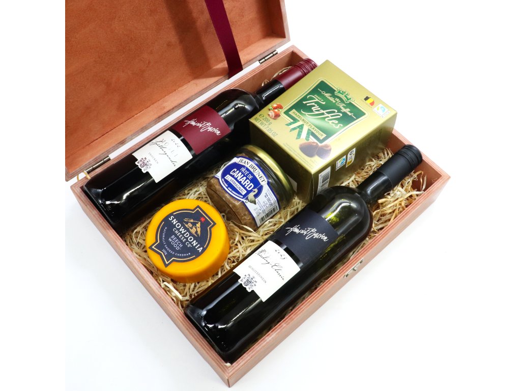 Krásná dárková sada s výběrem bílého a červeného moselského vína na dřevité vlně s vynikajícím Cheddarem a jelení paštice ve skvělé chuťové kombinaci udělá skutečnou radost každému milovníkovi svěžích moselských vín. Ideální a praktický vánoční dárek pro rodinnou sešlost, na posezení s přáteli nebo k narozeninám.