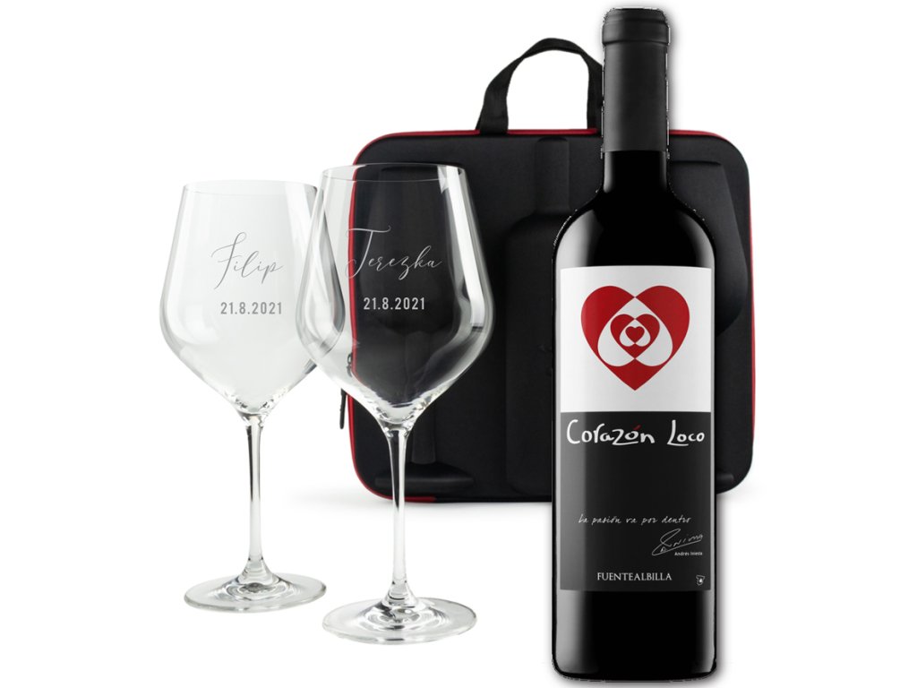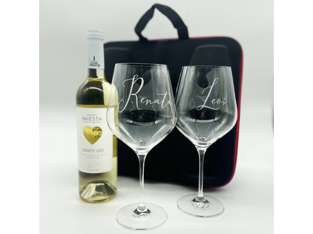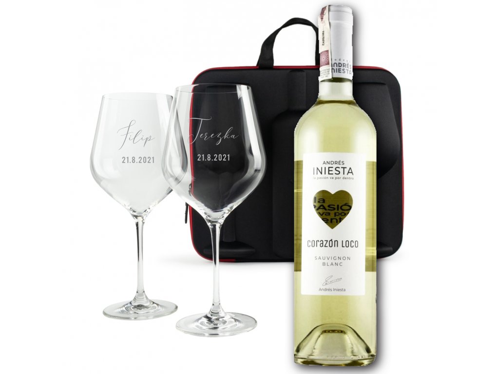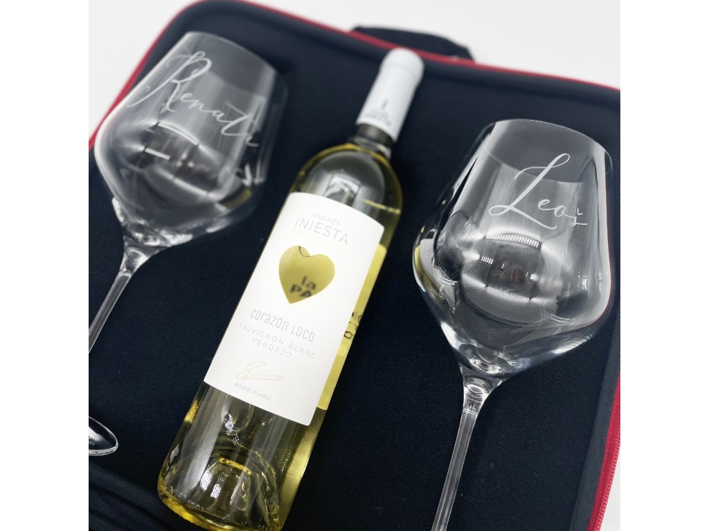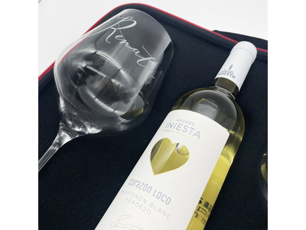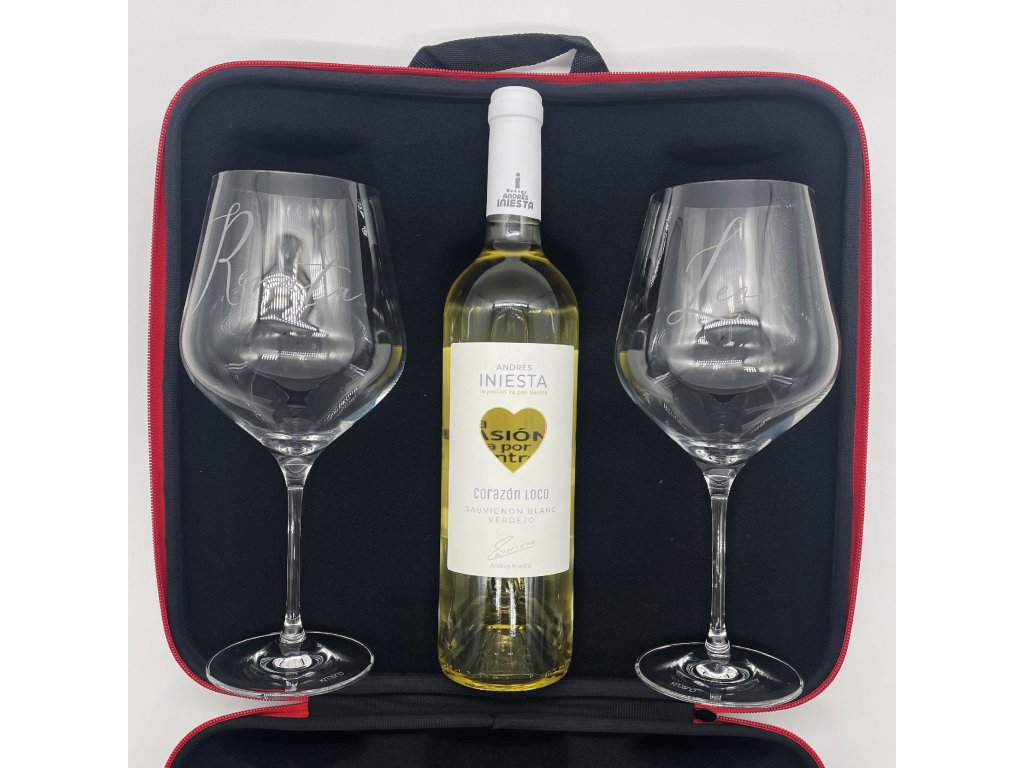 Dvě velké sklenice, k tomu ideálně zabalené na výjimečné cesty v dárkovém vyztuženém pouzdře s rukojetí, s lahvinkou dobrého bílého nebo červeného španělského vína. A aby byl dárek skutečně jedinečný, víno pochízí z vinařství legendárního španělského fotbalisty Andrése Iniesty, který jako velký milovník vína přináší tuto originální edici vín se symbolem srdce.