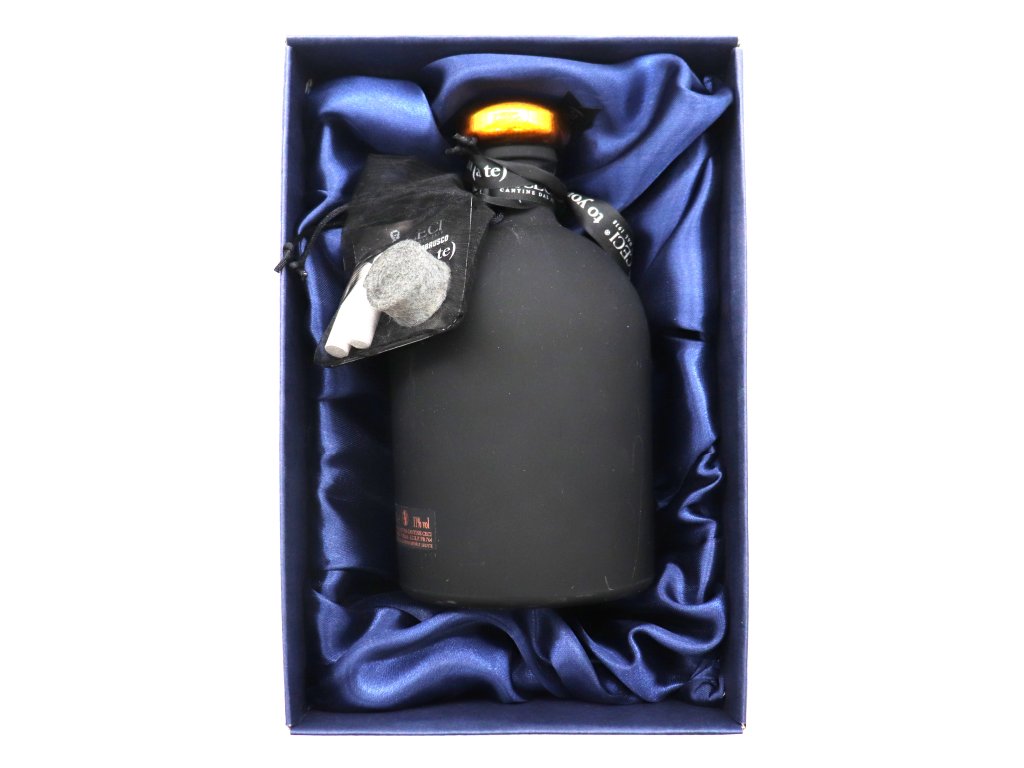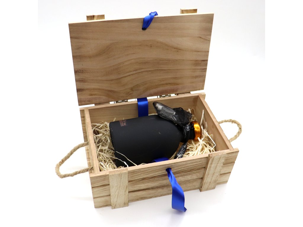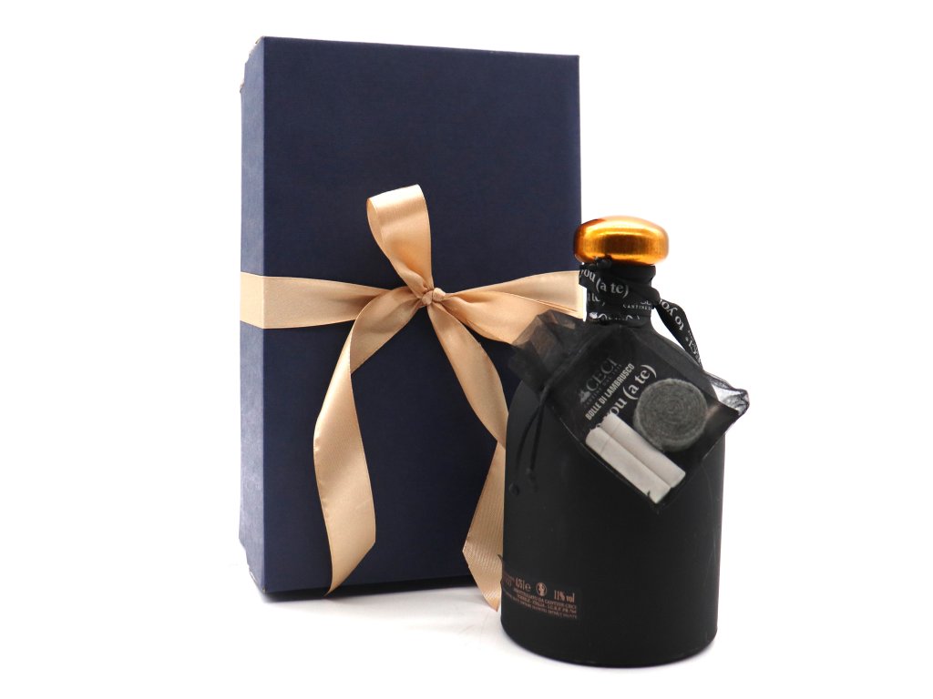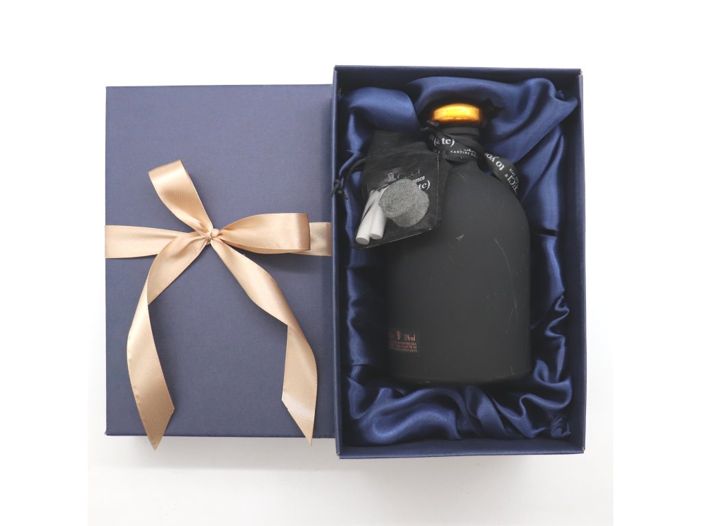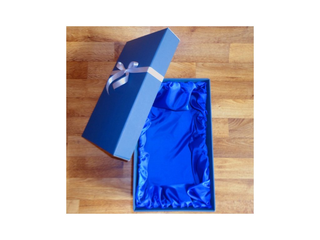 Karafa je v modré, vystlané dárkové kazetě se stuhou.