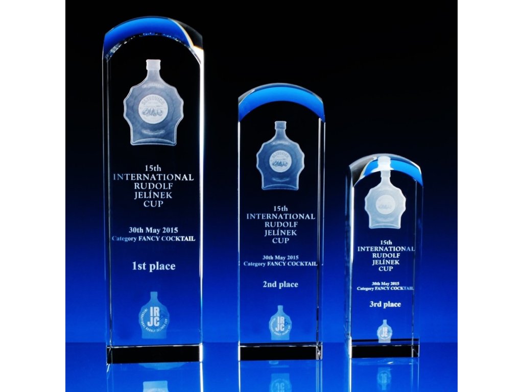 Sportovní trofej z optického skla se zaobleným vrškem.