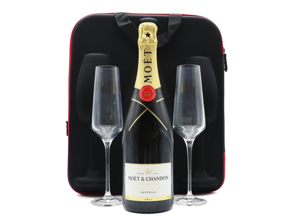 Dvě vysoké sklenky na champagne, k tomu ideálně zabalené na svatební cestu v dárkovém vyztuženém pouzdře s rukojetí, s lahvinkou vynikajícího francouzského šampaňského Moët.
