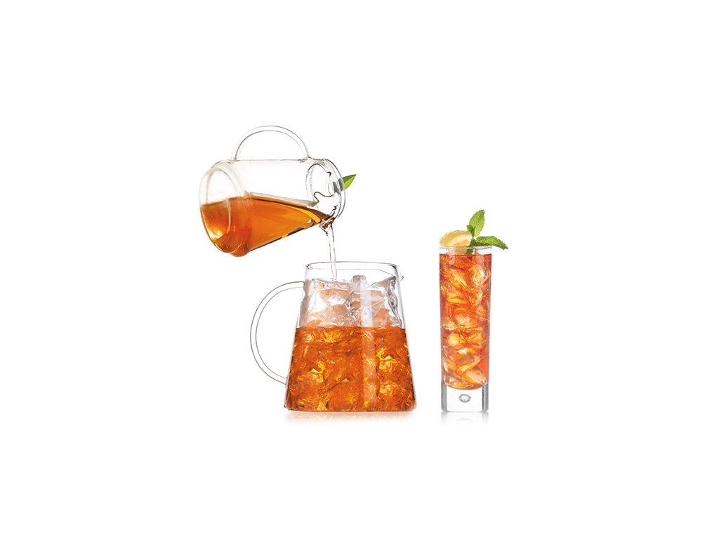 V horním džbáně s víkem vylouhujte horký čaj. Lahodně čerstvý čaj získáte tak, že vylouhovaný nápoj nalejete na led v dolním džbánku, kde sa rychlostí blesku schladí. Tyto plasticky navrhnuté nádobky z ručně foukaného skla odolného vůči vysokým teplotám jsou charakteristickým artiklem linie na přípravu ladového čaje Tea-Over-Ice™ a jsou určené na přípravu nápoje přímo na stole.