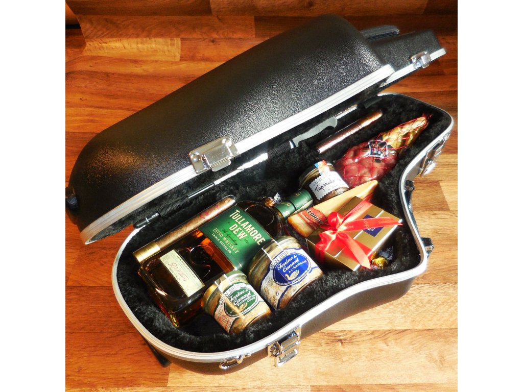 Originální dárkové balení v podobě skořepinového pouzdra na saxofon s luxusním senišovým polstrováním.